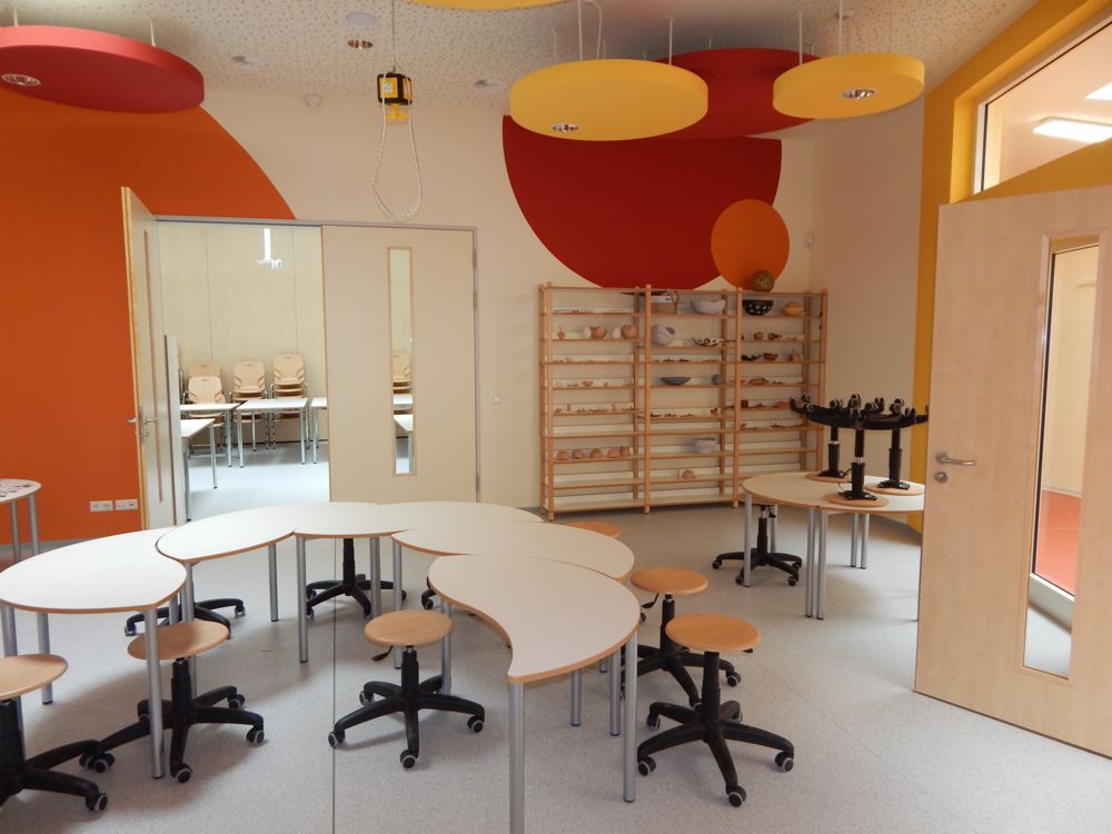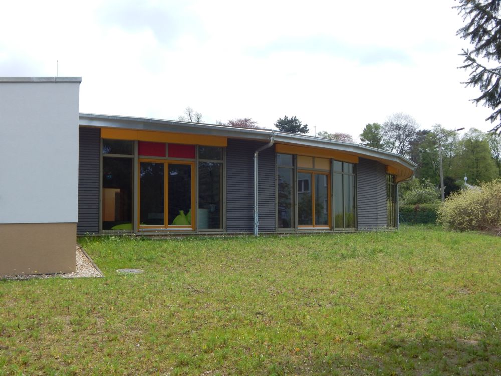 In Anbetracht der in den folgenden Jahren prognostisch weiterhin steigenden Zahl an Hortkindern, musste das Raumangebot des Hortes dringend erweitert werden. Allerdings war die erforderliche Anzahl von sechs Gruppenräumen im bereits vorhandenen Hortgebäude nicht einzuordnen. Nach Prüfung verschiedener Sanierungs- und Neubauvarianten, unter Berücksichtigung aller relevanten pädagogischen, organisatorischen und wirtschaftlichen Anforderungen, erhielt schließlich der Neubau als halbrunder Flachbau den Vorzug.